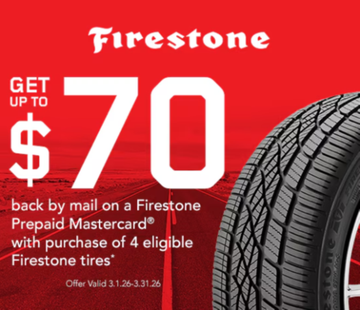 When your customers purchase a set of four select Firestone tires they may be eligible to receive up to a $70 Firestone Prepaid Mastercard® by online rebate. Offer valid on qualifying tires purchased at an authorized dealer and picked up or installed between 12:00 a.m. EST March 1, 2026 and 11:59 p.m. EDT March 31, 2026.